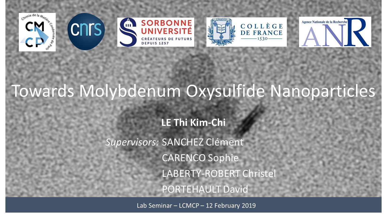 Feb. 12, 2019: LCMCP seminarToday, Kim presented her results during the weekly lab seminar. She discussed recent advances in the field of molybdenum-containing oxysulfide nanoparticles. A lively talk and a lot of questions from the room! |